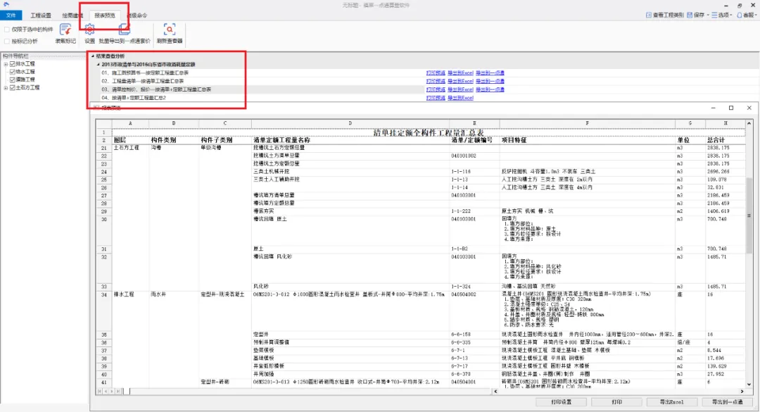 工程项目绘制完成后,刷新工程量,在报表预览界面,软件提供了清单汇总表、定额汇总表、清单挂定额汇总表,一次算量文件可输出多种格式的计价成果文件,最后