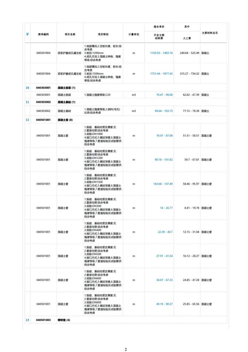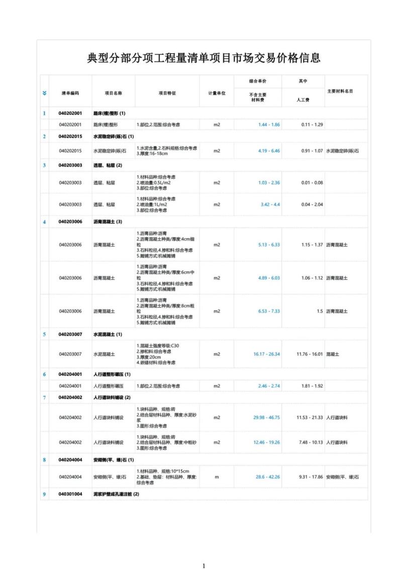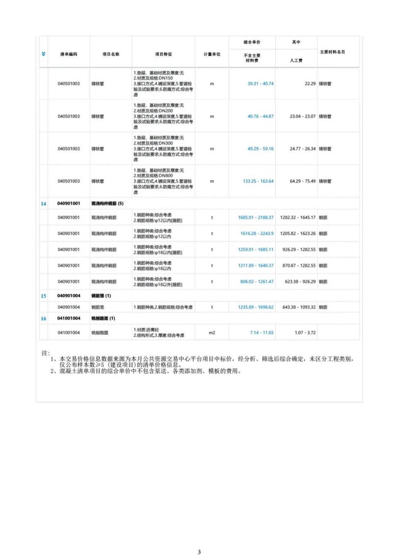 【市政专业】典型工程量清单项目市场交易价格信息