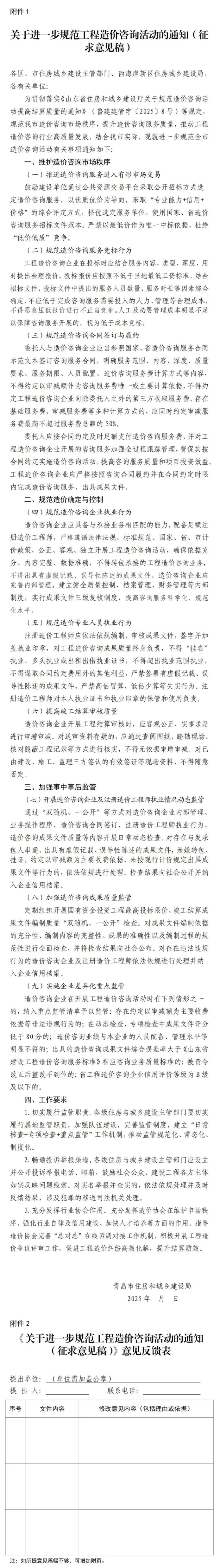为加强青岛市行政区域内房屋建筑和市政基础设施工程造价管理,规范工程造价咨询执业行为,提升造价咨询服务质量,推动工程造价咨询行业高质量发展,根据《山东省建设工程造价管理办法》《山东省住房和城乡建设厅关于规范造价咨询活动提高结算质量的通知》等有关规定,结合我市实际情况,我局起草了《关于进一步规范工程造价咨询活动的通知(征求意见稿)》(详见附件1),现公开征求社会意见。