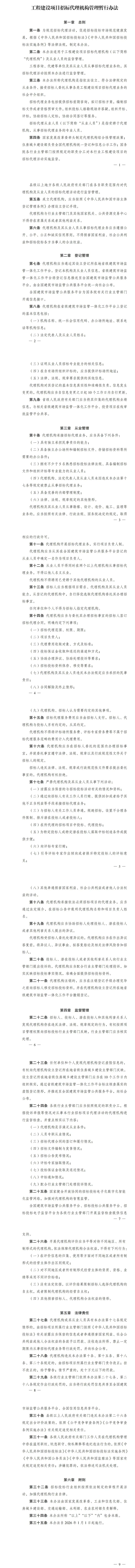 《工程建设项目招标代理机构管理暂行办法》已经2025年9月26日第23次国家发展改革委委务会议审议通过和工业和信息化部、住房城乡建设部、交通运输部、水利部、农业农村部审签,现予公布,自2026年1月1日起施行。
