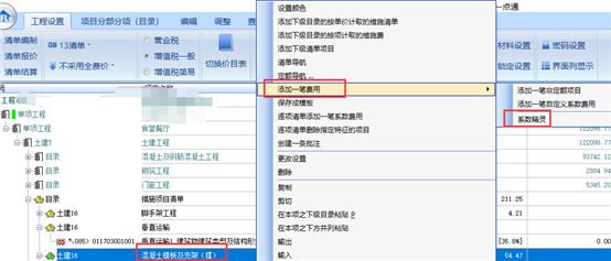 例如选中混凝土模板及支架(撑)项目右键—逐项清单添加一笔系数费用,实现将超高费计入到每项清单的综合单价中。