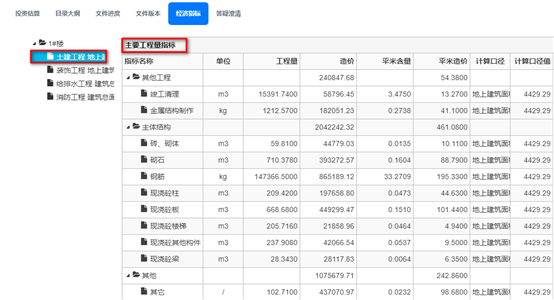 在一点通网页版“经济指标”板块可以的造价信息包括:各单项工程目录的工程特征、工程造价经济指标和主要人材机平米含量指标,以及各单位工程的主要工程量指标。